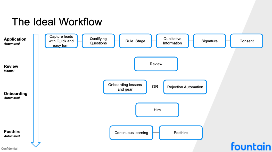 You’ve said that your team breaks up the high-volume hiring process into three main parts: sourcing, screening and post hire, which ropes in onboarding and activation of new hires, as well… How do these three different buckets work for clients who haven’t worked with Fountain before or are entirely new to high-volume?